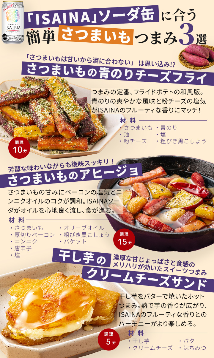 第1回となる今回のおつまみテーマは、本品のベース焼酎「ISAINA」の原材料でもある「さつまいも」。その甘やかな味わいから一見、「おつまみには不向き?」と思われがちな食材ですが、ゆり子さんの目から鱗のアイデアで酒がすすむ絶品つまみに! 自宅にストックしやすい干し芋を使ったレシピも注目です!