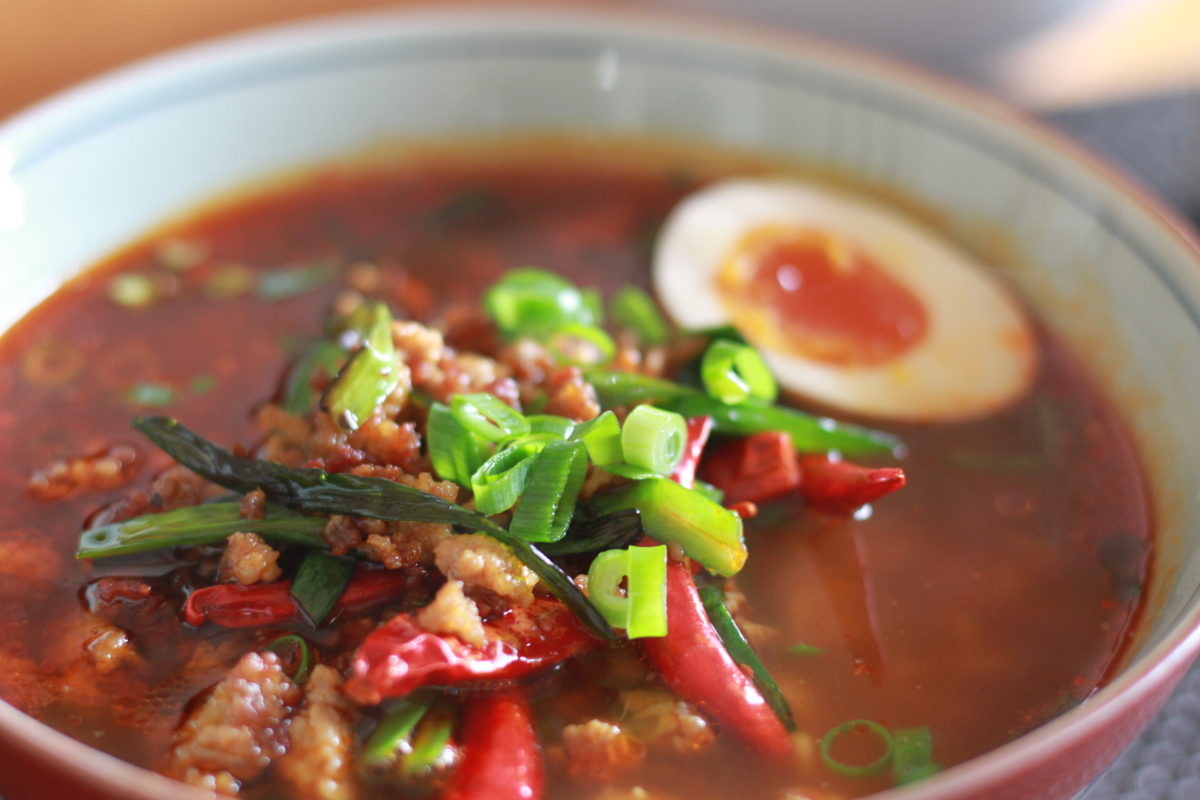名前は「台湾ラーメン」ですが、実は名古屋のソールフード。筆者はネギ、生姜、ひき肉、鷹の爪、ニラを炒め、麻婆豆腐の素で味付けした具をトッピングしてみました。スープは鶏ガラをベースに豆板醤を加えた濃厚スープ。ピリッとした刺激のなかにも旨みがたっぷりで、縮れた細麺によく合います。こちらは麺をすする箸が止まらなくなるほどのベストの組み合わせ。スープのパンチも相当ですが、筆者はのどごしの良いノンフライ麺に心を奪われました。全身の毛穴から汗が吹き出る本格的な辛さもいいですね!