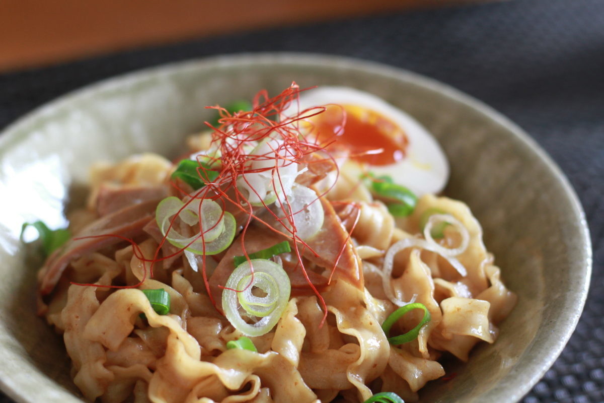 さっぱり系の味付けで、もっちりした平打ち麺の食感が楽しい