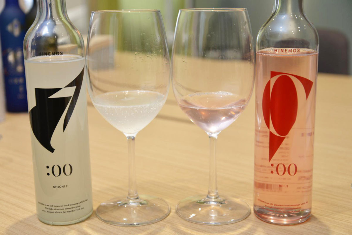 飲む時間をコンセプトにした「HINEMOS」(神奈川県・井上酒造)。ボトルの前衛的なデザインも特徴ですが、味も斬新。スパークリングの「7時」(左)は甘味と酸味がキレイに両立。赤色酒の「0時」(右)は甘美でフローラル。