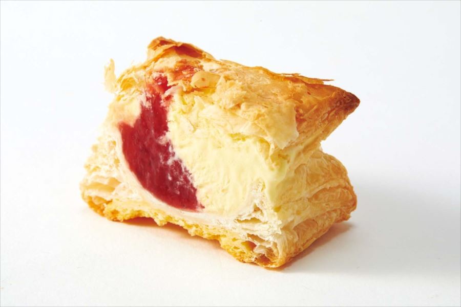 パイ生地を一枚一枚手で重ねて焼き、サクサクの食感に。その中には、風味豊かなバニラビーンズシード入りカスタードアイスと、いちご果肉入りの甘酸っぱいソースが入っています。ケーキのようなアイスです。