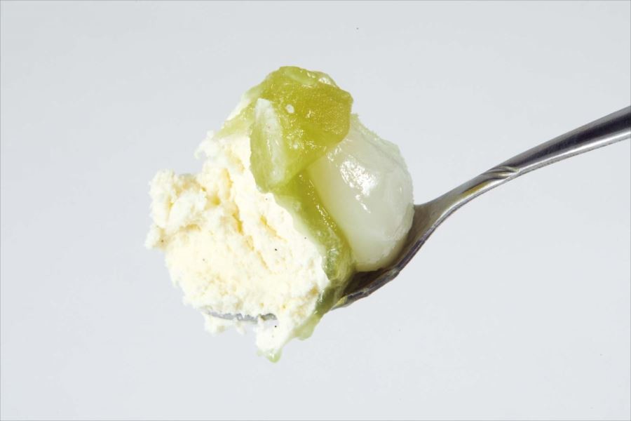 メロンに合う爽やかな味わいのバニラアイスに、メロンピューレを22%使ったソースと、ゴロッとしたメロン果肉、おもちをトッピング。冷凍でも柔らかいおもちには、白ワインで華やかな風味をプラスしています。