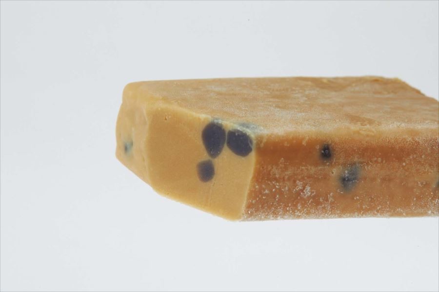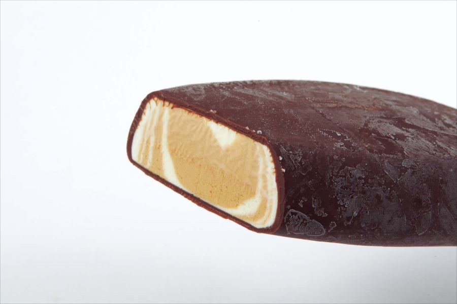バナナピューレと果汁を練り込んだバナナアイスとキャラメルアイスを口どけの良いチョコで包んだ至福の一本。キャラメルアイスに入った岩塩が、甘さを引きたてるとともに後味をすっきりさせます。