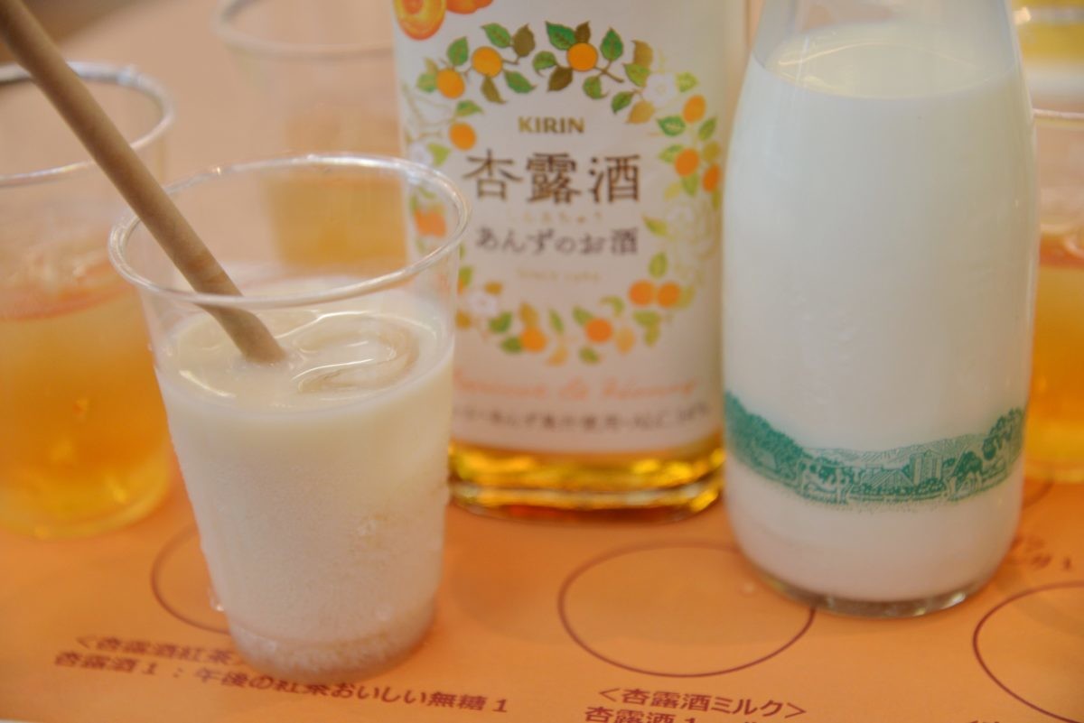 発表会では、杏露酒による多彩なアレンジを試させてもらいました。割る素材によって、キャラクターを変えるのが興味深いところ。特に意外だったのが牛乳とのブレンドです。あんずのまろやかな酸味が見事にとけあい、杏仁豆腐やマンゴーラッシーのような爽やかで甘酸っぱい味になりました。