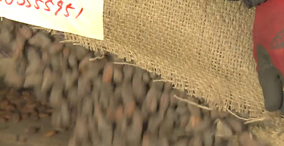 ↑ 仕入れたカカオ豆を挽くために機械に投入する様子
