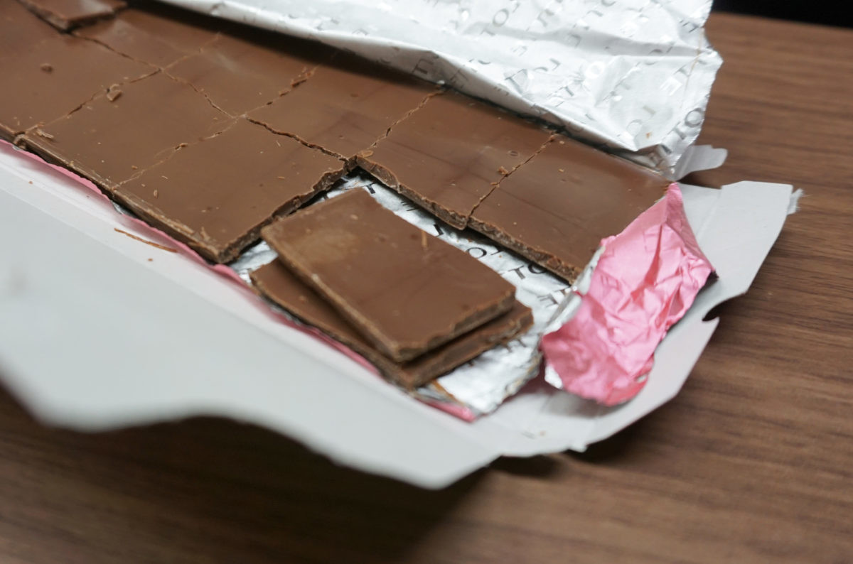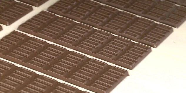 ↑ 板状に成形し、完成したガーナミルクチョコレート