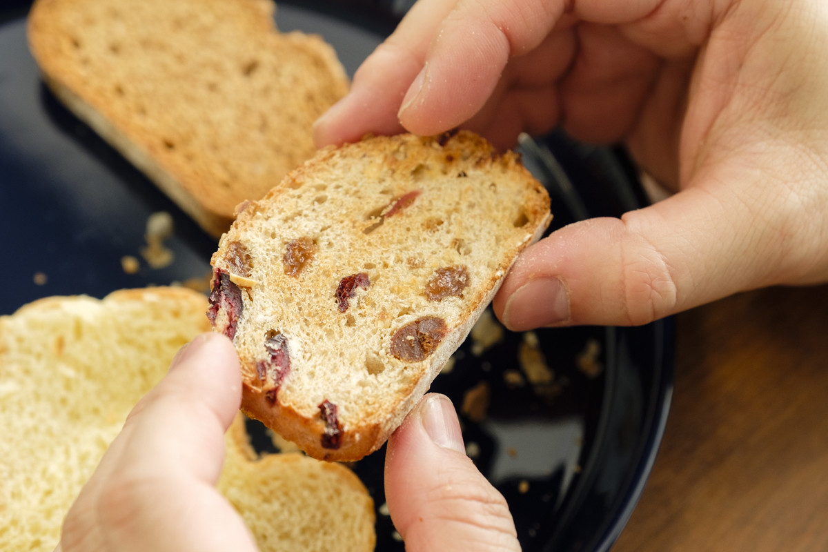 中山 結構密度のあるパンだと思いますけど、冷凍とは思えない食感。やっぱりドライフルーツ、ヘーゼルナッツがアクセントになっていてお酒に合いそうですね。ワインでも、ウィスキーでも、ビールでも。実際、こういうタイプのパンがワインバーでおつまみとして出ていることがあります。これはオススメです。