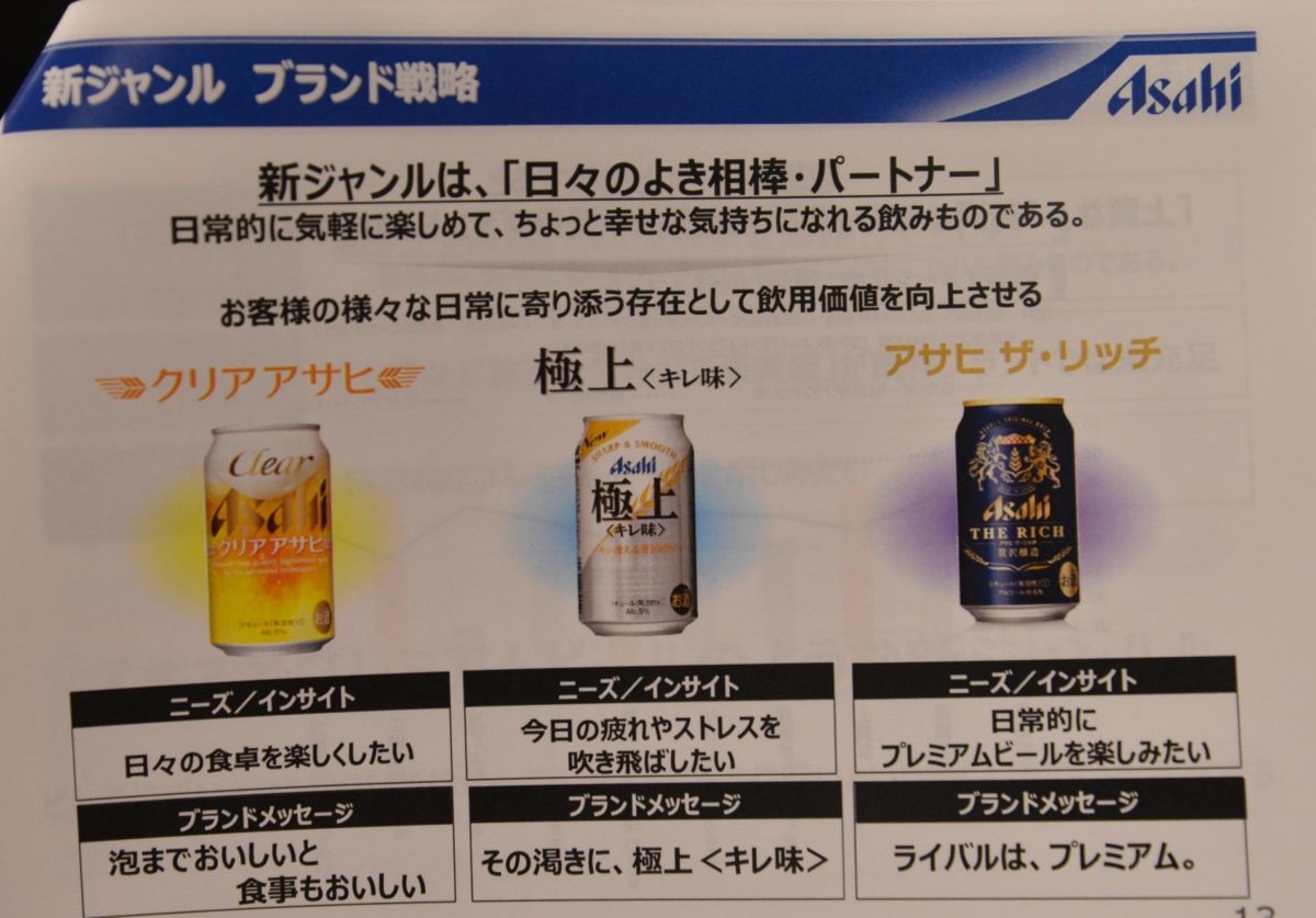 発表会では既存ブランドについての話もありました。同社を代表する新ジャンルといえば、「クリアアサヒ」と「極上<キレ味>」です。マーケティング方針としては「魅力あるブランド価値を、一貫性をもって確立する」ということで、各商品の方向性がより明確に提示されました。