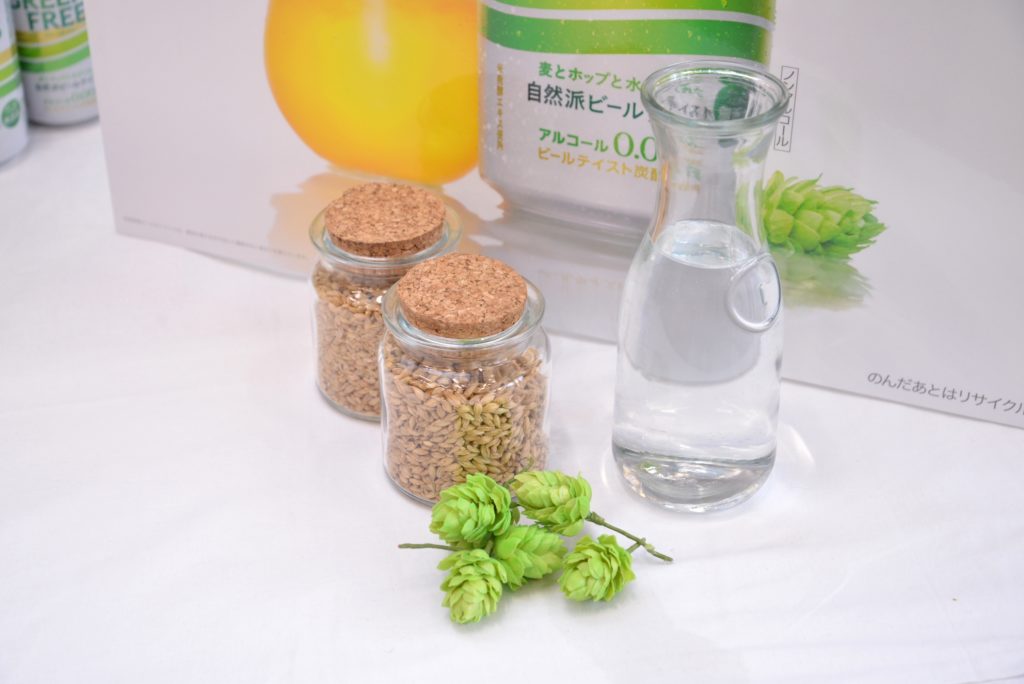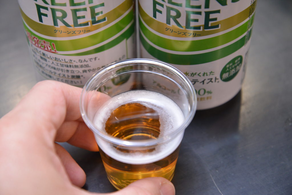 事実、その製法は既存のノンアルコールビールとは一線を画すもの。通常は香料や人工甘味料などを使い、ビールに近い味を再現するところを、技術革新によって添加物を使わずとも可能に。たとえば、麦本来のうまみは「一番搾り」の醸造法を応用。ホップ由来の爽やかな香りは、「淡麗グリーンラベル」などで使っている製法を一部に採用し、新たなおいしいビールテイストを実現しているそうです。ということで、いよいよ試飲へ。