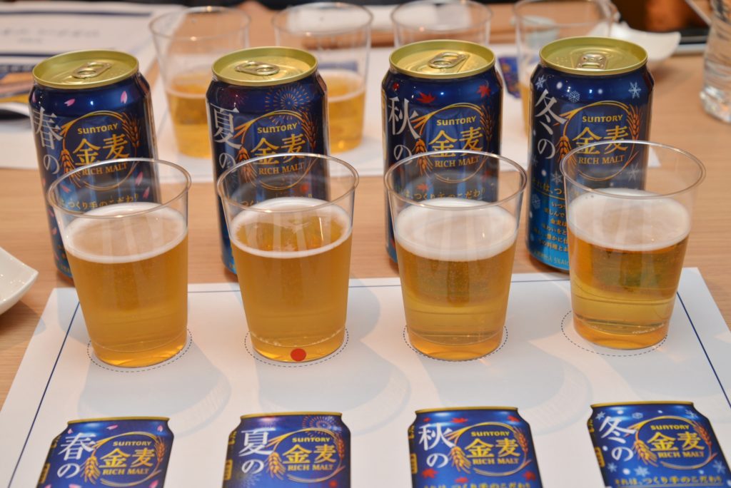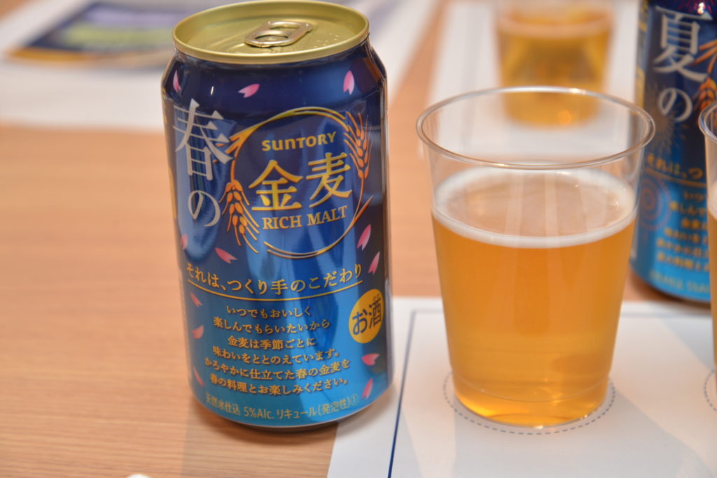 日本には四季があり、季節によって食べる料理も変わります。であれば、合わせるビールも季節にあった味わいであるべき、という考え方ですね。ペアリングを重視するブランドであれば、ある意味当然のことかもしれません。発表会では春夏秋冬4つの「金麦」試飲体験もできるということで、飲ませてもらいました。まずは春から。