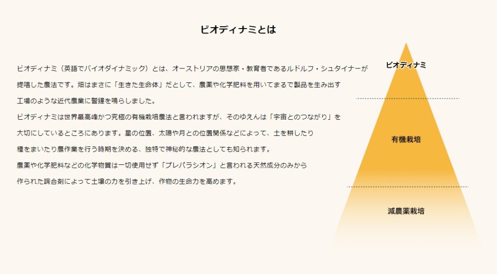 そして究極の有機栽培農法といわれるのが「ビオディナミ」。「ビオロジック」の特徴に加え、星、太陽、月との位置関係などによって農作業の時期を決める、独特で神秘的な農法としても知られます。