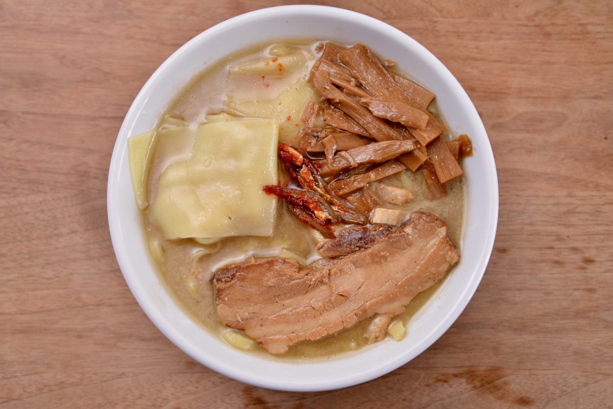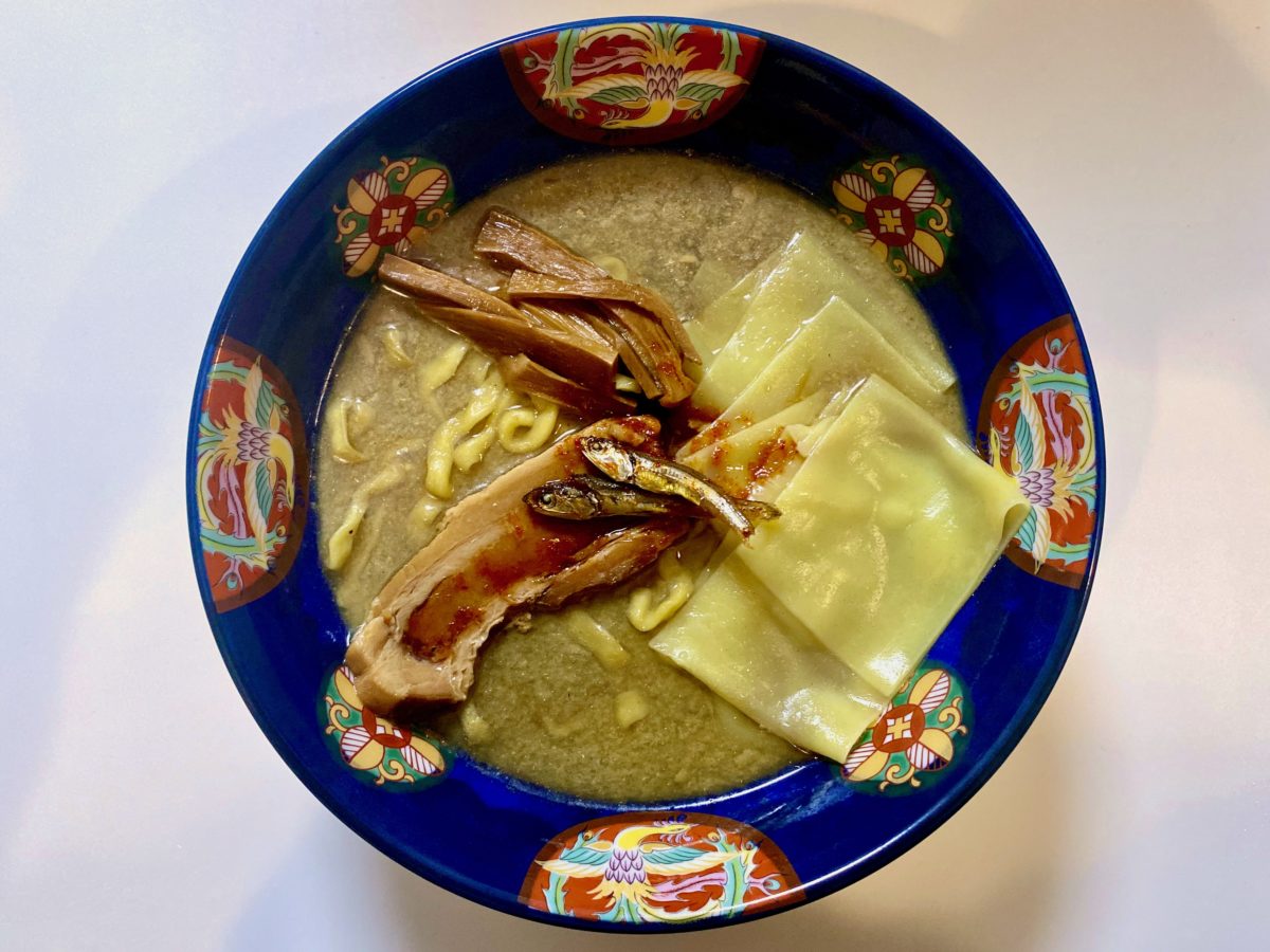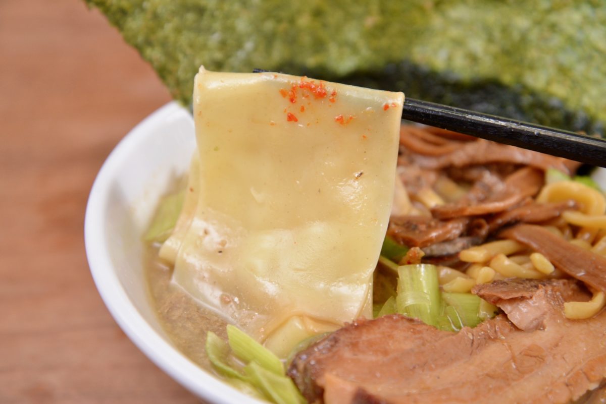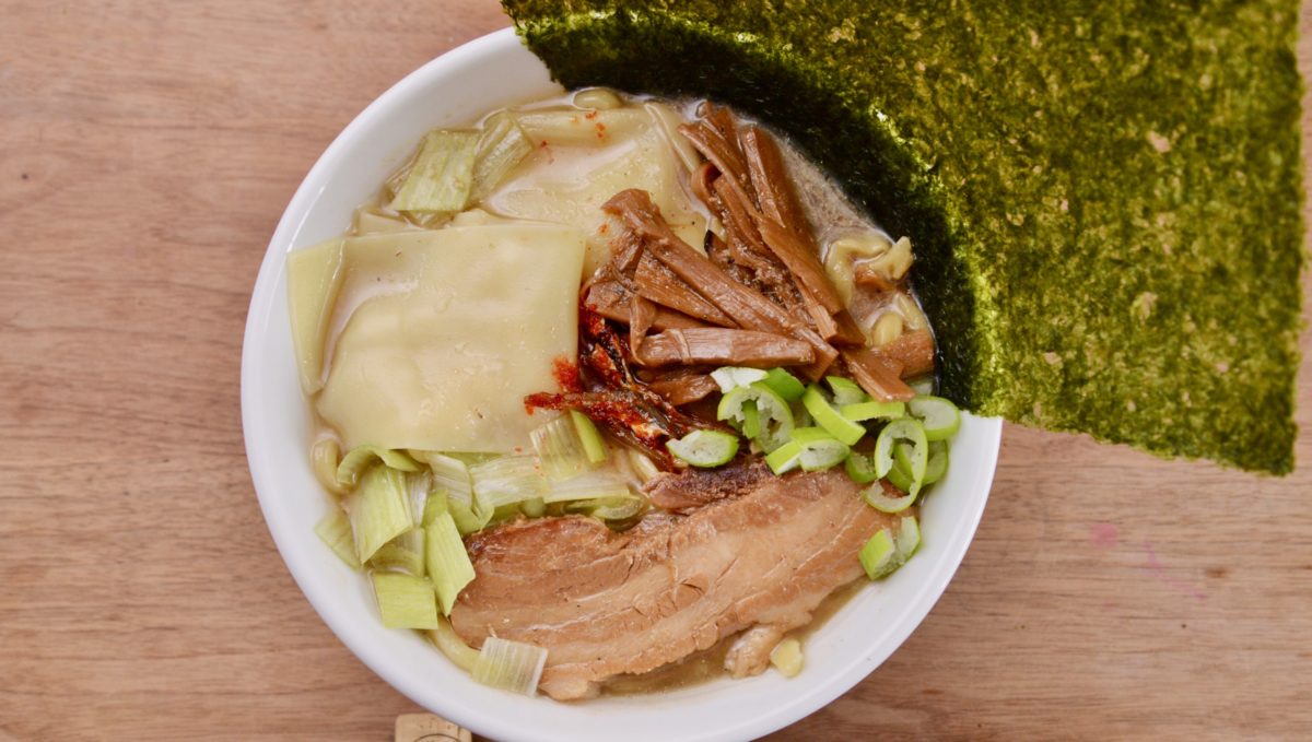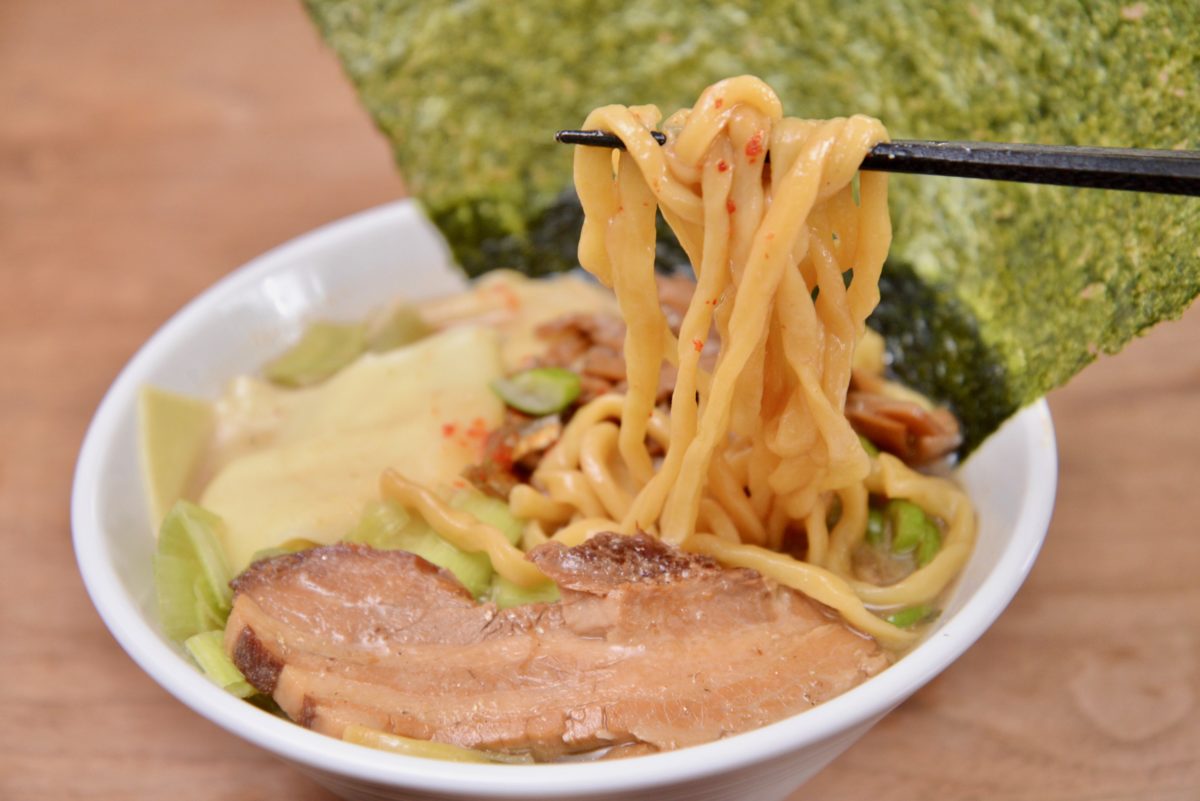 極太麺といったん麺、2種の食感を味わえるのも楽しい。特に後者は、幅広いチュルッとしたタッチで、アクセントにちょうどいい心地よさ。柔らかく煮込まれたチャーシューとメンマも相まって、圧倒的な幸福感で満たしてくれる。