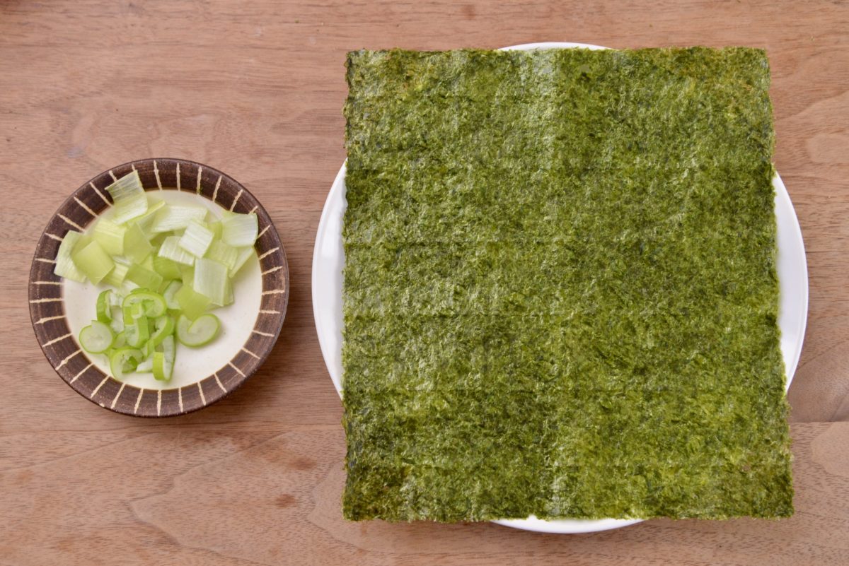 田中さんのアドバイスにしたがって、ネギを別でトッピング。凪独自の「駒葱」は、四角く駒のように切るのがポイントだ。また、凪はのりのトッピングがデカすぎるのも特徴なので、全形のりをそのまま添えることにした。