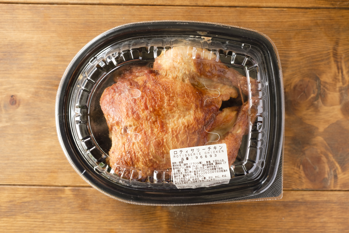 コストコのあらゆる商品の中でも特にコスパに優れているロティサリーチキン(699円)。丸鶏をローストしたものですが、もちろんこのままでもかなり美味しく食べられます。でも、ただ鶏の肉をムシャムシャ食べるだけでは芸がない! ……と言い張って、今回は7品目の料理に転じてみました。つまり、1日1回、ロティサリーチキンに絡んだ料理を作るとすれば、一週間ずっとチキンを楽しめるという寸法です。それではいってみましょう!
