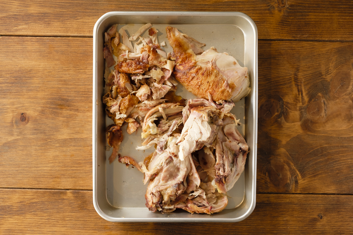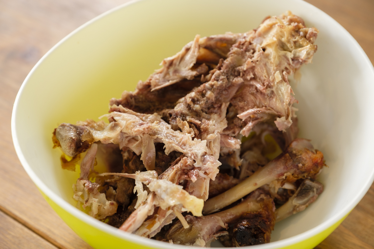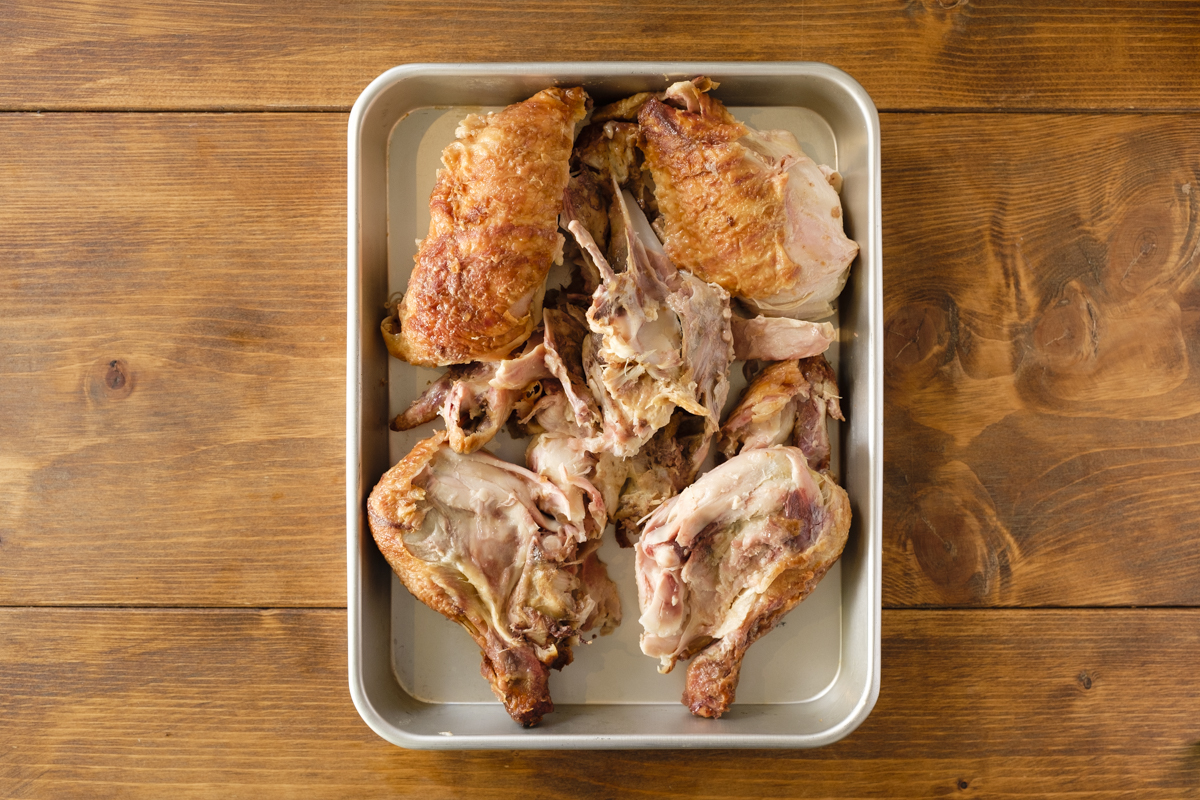 ロティサリーチキンをばらしたところで、まずは骨と身に分けます。鶏肉のプリッとした感触がいかにも美味しそうで食べたくなってしまいますが、グッとこらえて先立って骨の処理に専念しましょう。骨は、あらゆる料理に流用できるスープの元になりますが、スープを炊くのに1時間ほど時間がかかります。まずは骨から綺麗に身を取り、骨を洗ってスープに転じることから始めましょう。