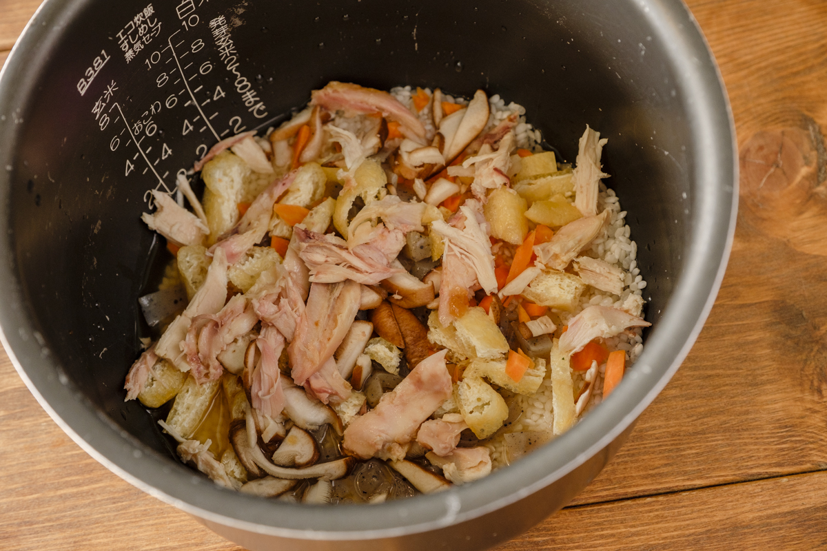 続いての料理は、ロティサリーチキンを使っての炊き込みご飯です。コストコのロティサリーチキンはハーブや香辛料などが塗られていますが、その風味はさほどクセのあるものではありません。もちろん和食にも違和感なく合いますので、前述の万能チキンスープ、ロティサリーチキンの身を使ってご飯を炊き込んでいきます。
