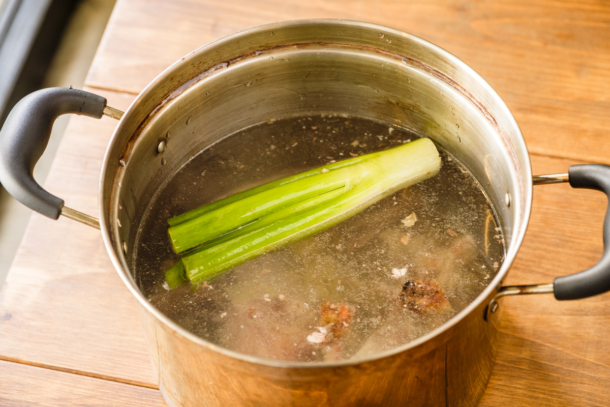 ③鍋にチキンの骨、すりおろした生姜とにんにく、ネギの青い部分を入れ強火にかける。沸騰寸前のところで弱火にし、綺麗にアクをとる(白濁化させたい場合は、鍋に蓋をし中火~強火にすると良い)