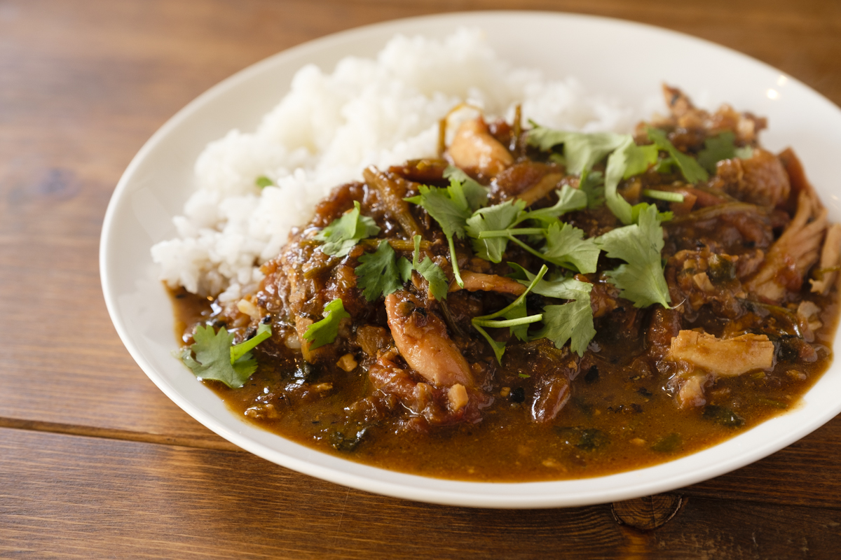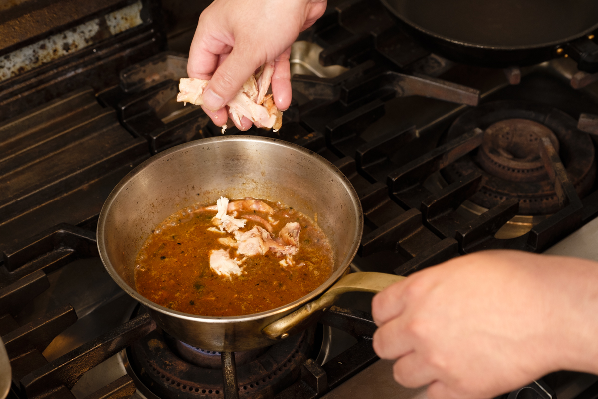 スープの仕込みを終えたら、いよいよ料理を作っていきます。まずはスパイスから作るカレーです。先ほどの万能チキンスープを流用することで、ダシたっぷりのコク深いカレーが完成します。もちろん、ロティサリーチキンの身もたっぷり使いますので、チキン特有の食感も十分楽しめます。