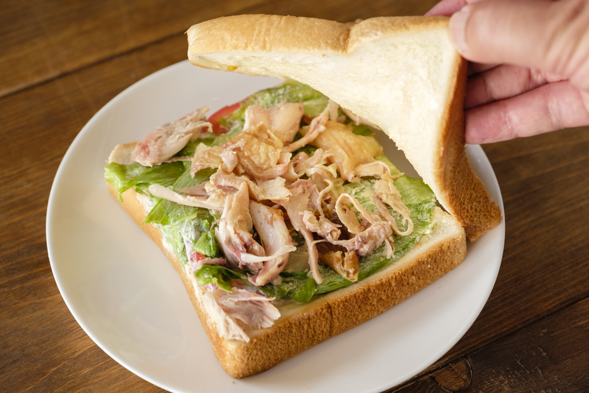 続いては、ロティサリーチキンを使ってのサンドウィッチです。手掴みで気軽に食べられる上、ハンバーガーよりもクセがなく、もちろん野菜もしっかり取れます。火をいっさい使わずに完成させられるので、キッチン環境を問わず作ることができるのも利点です。