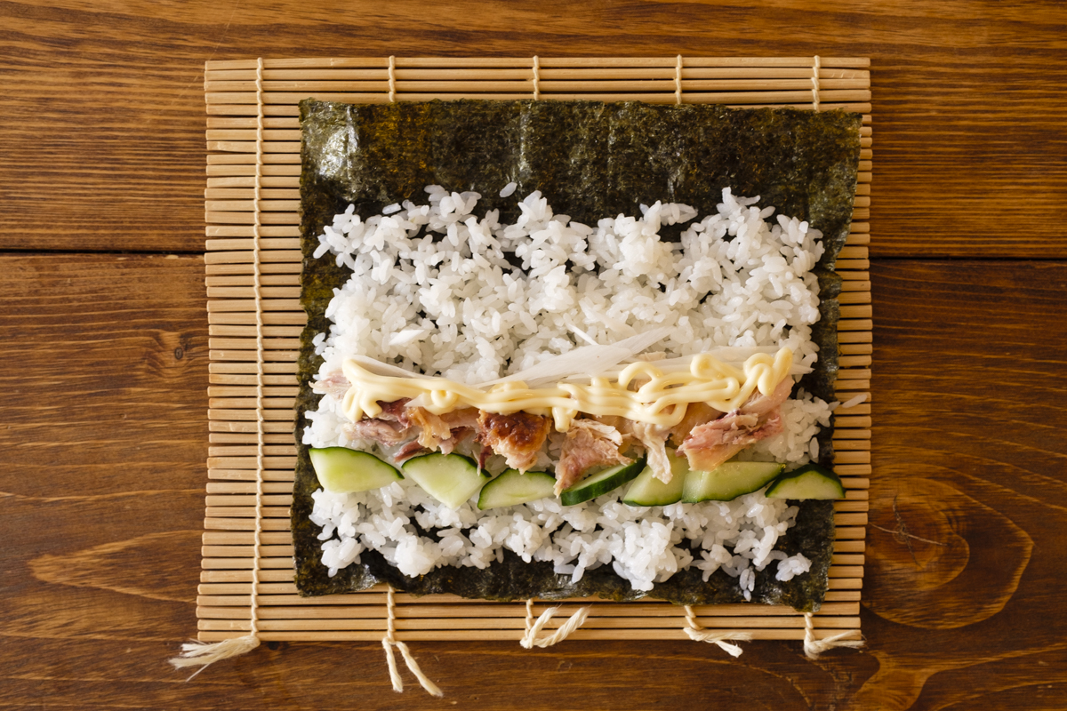 「チキン海苔巻き(8切分)」 <用意するもの> ・ロティサリーチキン……適量 ・お米……1合 ・米酢……30cc ・きび砂糖……大さじ2 ・塩……少々 ・きゅうり……適量 ・ネギ……適量 ・マヨネーズ……適量 ・焼きのり……1枚