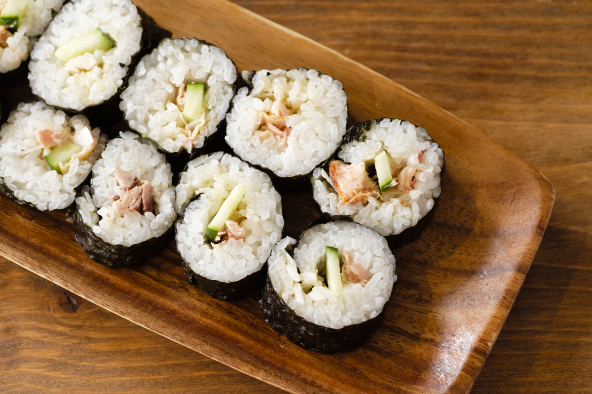 続いては、ロティサリーチキンを使っての海苔巻きです。こちらも手掴みでパクパク食べられます。きゅうり、ネギなどと合わせることで、コクのあるロティサリーチキンとのバランスが取れて、意外とサッパリとした味わい。夏場でもモタれることなくお腹いっぱいになれます。