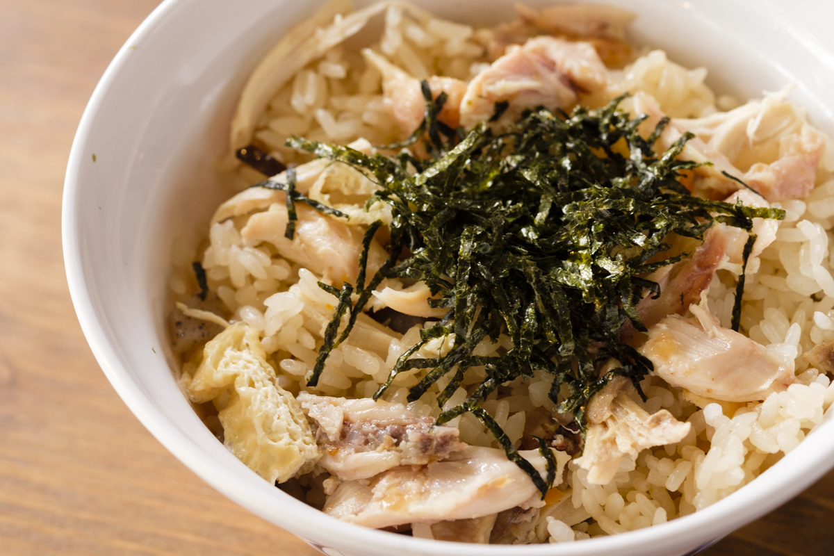 「鶏炊き込みご飯(2合分)」 <用意するもの> ・ロティサリーチキン……適量 ・万能チキンスープ……炊飯器の2合メモリ分 ・米……2合 ・にんじん……2分の1 ・こんにゃく……3分の1 ・しいたけ……2枚 ・油揚げ……1枚 ・醤油……大さじ2 ・酒……小さじ1 ・刻み海苔……適量