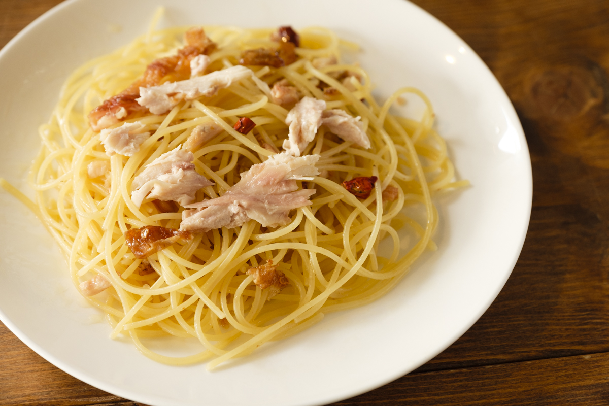 続いてはスピード勝負のメニュー、ペペロンチーノにロティサリーチキンを流用します。ベースとなるソースはニンニク、唐辛子、ロティサリーチキン、オリーブオイルを混ぜて火にかけるだけ。そこに茹でたパスタを和えれば即完成します。ズボラな人でも失敗なくすぐできるメニューです。