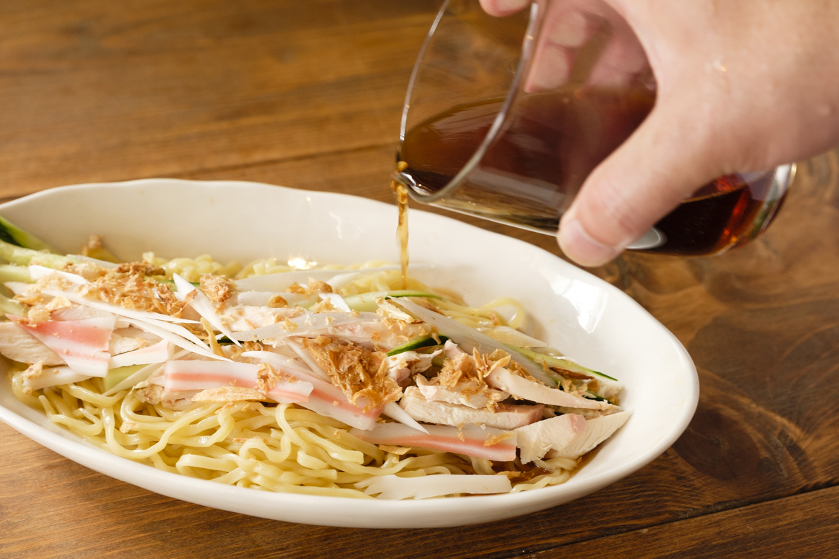 続いては、暑い時期に特に食べたくなる冷やし中華の具にロティサリーチキンを使ってみます。茹でて水でシメた麺に、切った具材を乗せてタレをかけるだけ。超簡単で味にもブレがない夏の定番メニューが、ロティサリーチキンでどう化けるかに挑戦!