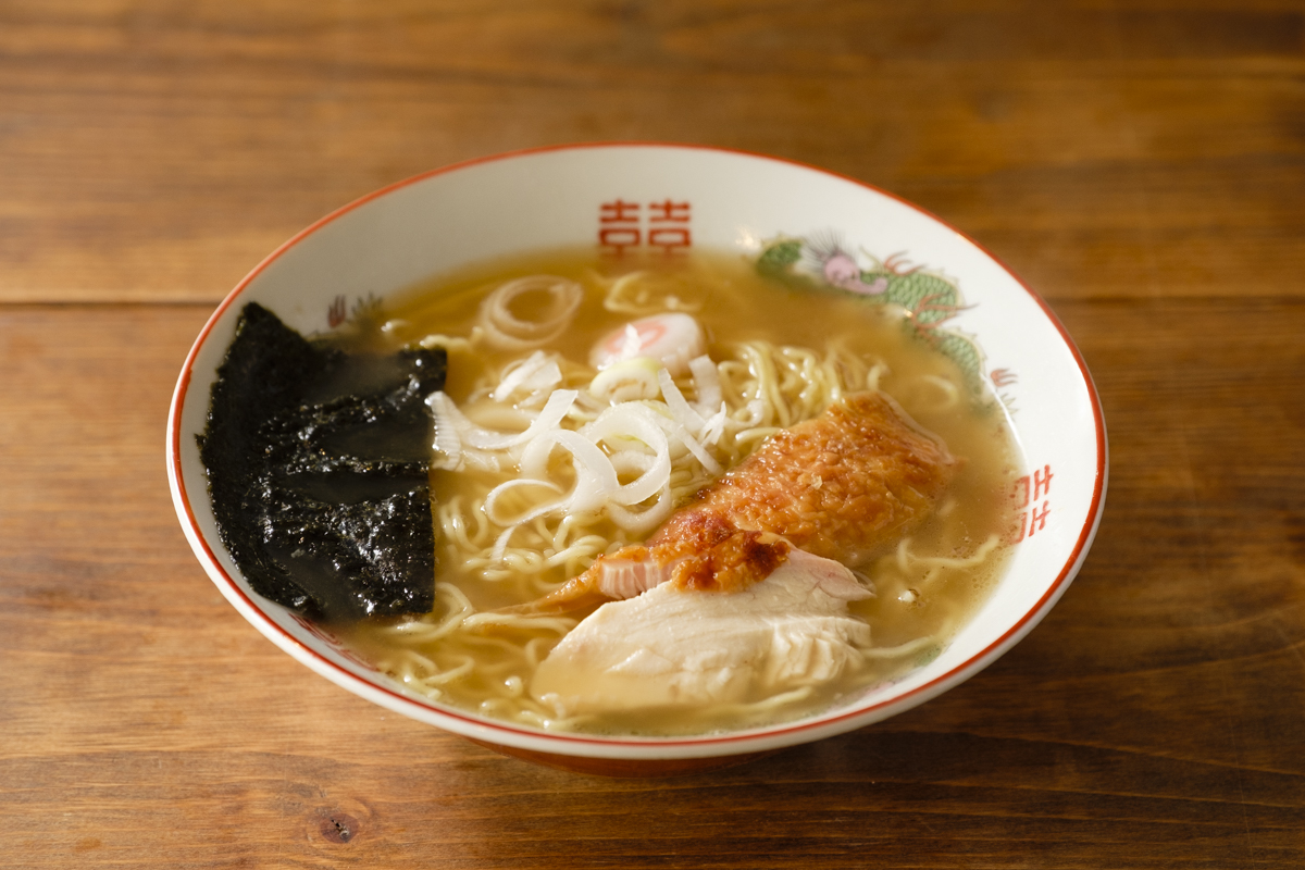 そして最後がロティサリーチキンで取った万能スープを使ってのラーメンです。いわゆる鶏ガララーメンで、町中華のようなあっさりとした味わい。焼豚代わりにロティサリーチキンの身も乗せれば、その汎用力の高さを感じるメニューです。