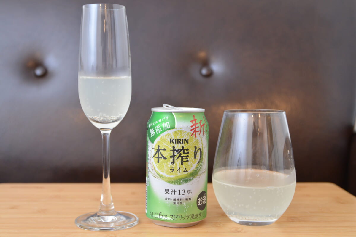 最後に紹介するのは、グラスを変えるだけで「本搾り」の味わいが変わるという実験。片方は広口グラス、もう片方はすぼまったフルートグラスを用意して、それぞれにライムを注いで味の違いを確かめてみました。