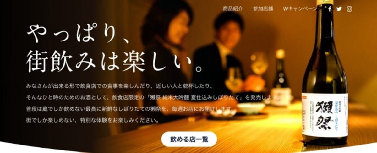 なお、本企画を後押しする取り組みとして、9月30日までの期間にSNSで「獺祭」が毎週当たるキャンペーンも展開中。「獺祭 純米大吟醸 夏仕込みしぼりたて」をお店で飲み、写真に「#街飲み獺祭」を付けてSNSに投稿すると「獺祭 純米大吟醸 磨き二割三分」の四合瓶が毎週23名に当たるというものです。こちらもぜひチェックしてみてください!