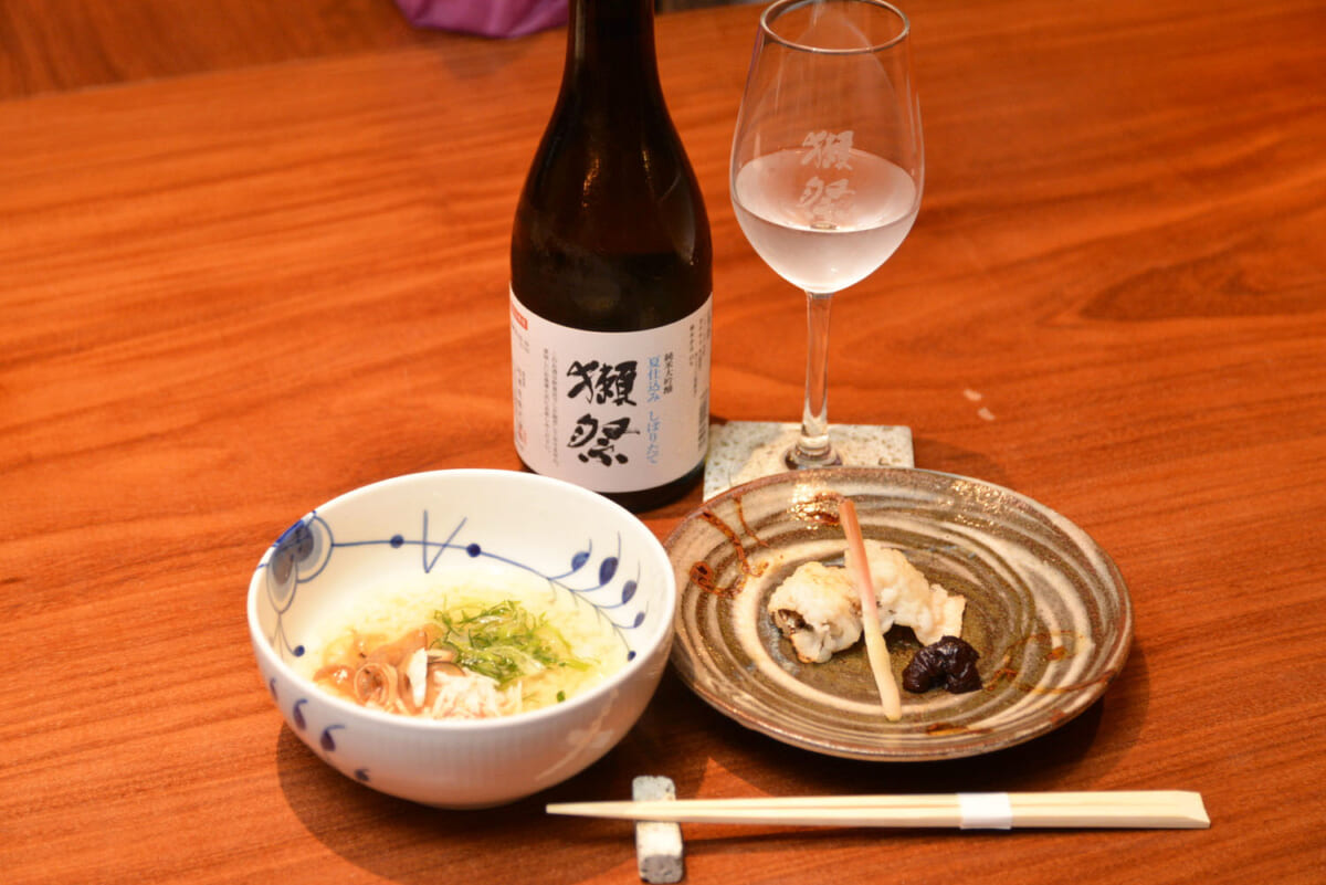 試食した料理は、どれも夏らしい和食。はもの白焼きと、山口・下関産のとらふぐを使った冷やし雑炊です。どちらも、魚介のうまみが前面に出た力強い味で、生酒のみずみずしくエネルギッシュな味わいと調和していました。