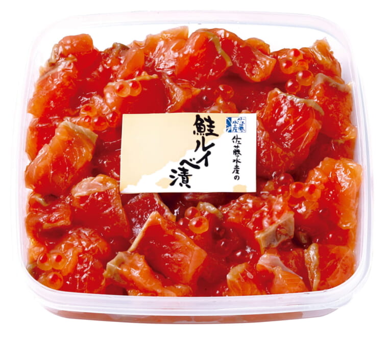 北海道産の天然鮭の身といくらを「鮭醤油」が入ったたれに漬け込んだベストセラー珍味。身の歯応えと透明感、とろける食感に凝縮された旨みが楽しめる。全国各地で開催される北海道物産展でも人気が高い。