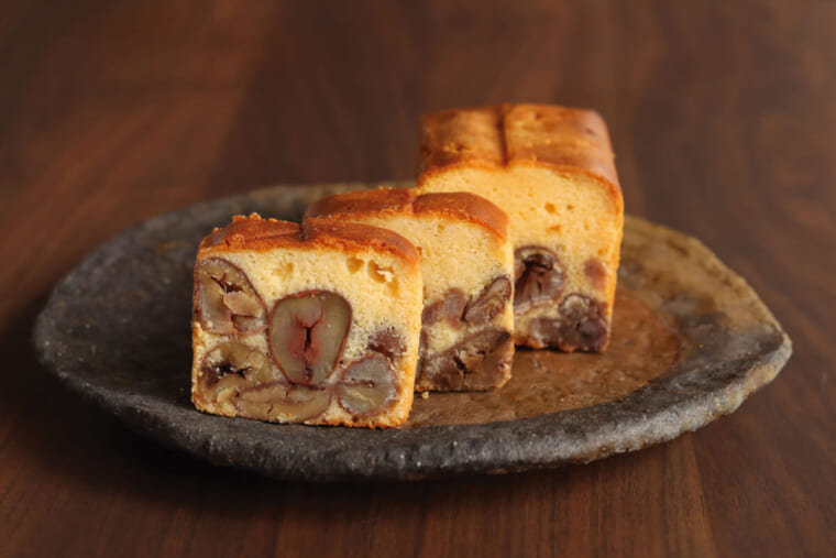「2種類の栗をたっぷり使ったパウンドケーキ。フランス菓子ですが、和三盆糖のやさしい甘さに包まれ和菓子のような味わいです。冷蔵で約2週間日持ちするのもうれしいポイント」