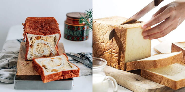 フランス産の最高級発酵バターを使用した名物食パン1本と、チョコや安納芋など3種から選べる季節の食パン1本に、フレーバーティ1缶とキャラメルバター2瓶が付く。食べ比べを楽しめる贅沢なセット。