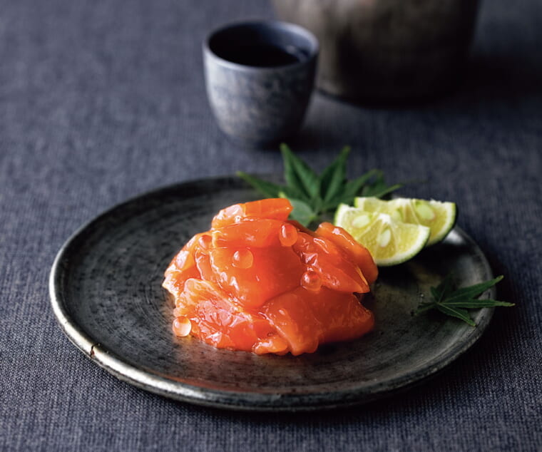 「凍らせた生鮭をしょうゆで漬けた珍味『鮭ルイベ漬』は、酒のアテにピッタリ。一般的には鮭のみですが本品はいくらも使っていて、より贅沢な気分になれます。冷凍品なのでストックも可」