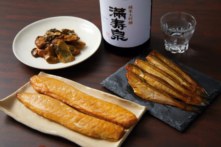 名漁場である富山県の氷見を拠点に江戸時代から続く魚問屋が、吟醸酒のパイオニアと名高い富山の雄・桝田酒造店とタッグ。銘酒「満寿泉」の四合瓶に、ふぐ、はたはた、かきの燻製がセットとなる。