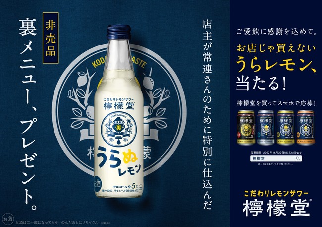 今回のキャンペーンは、檸檬堂の店主が、気分が乗ったときだけ常連のお客さんに出すという裏メニュー「うらレモン」が、6本1組セットで抽選で5000名に当たるというもの。この「うらレモン」は非売品のため、このキャンペーンでしか飲むことのできない貴重なものとなっています。