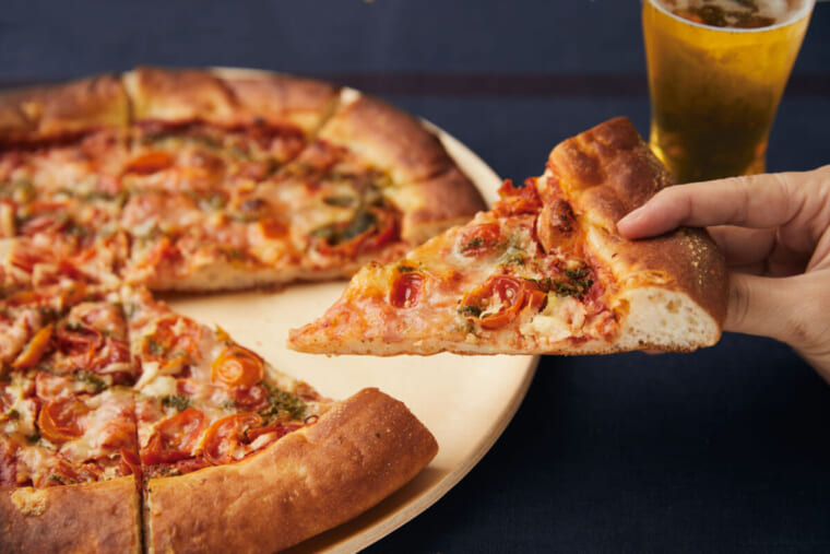 オリジナルのピザ生地を使った手作りピザ。ふっくらとした厚みがあり耳までおいしい。直径約30cmとサイズも十分だ。王道のマルゲリータのほか、4種チーズや明太子ポテト、季節限定商品などをラインナップ。
