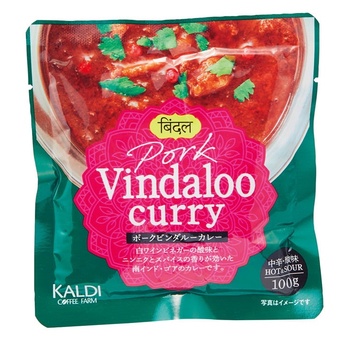 「カレーファンを中心に人気急上昇中のポークビンダルを、早速PB化しているアンテナの感度はさすがカルディ。しかも昨今話題のあいがけカレーを想定してか、少容量なのも秀逸。カレーの最新トレンドがこのレトルトに詰まっています!」