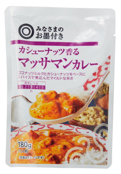 タイ王国に起源を持つと言われる魅惑的な味のカレーを再現。ココナッツミルクとカシューナッツをベースに、数種のスパイスで煮込んでいる。マイルドな辛さとまろやかな甘味が特徴。チキンとじゃがいもが入っている。