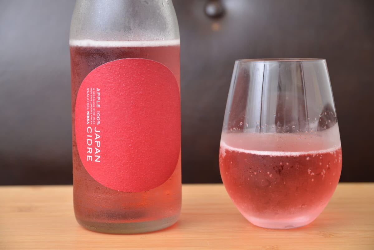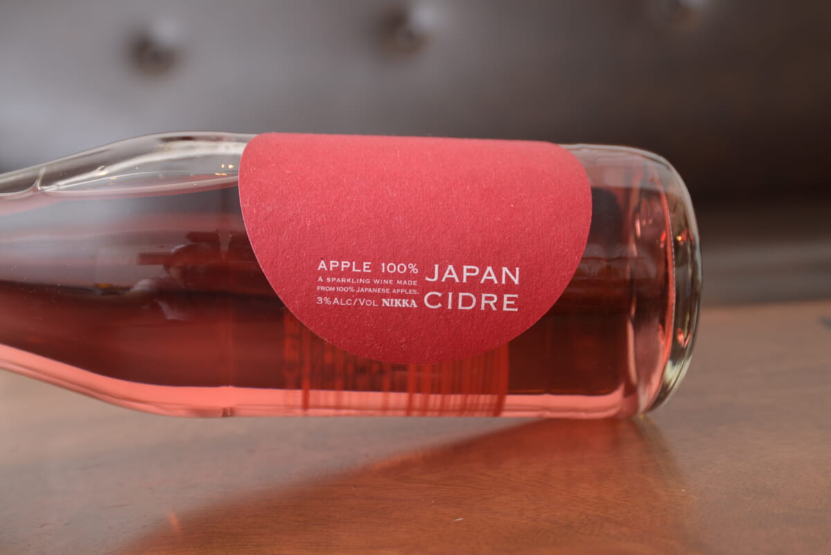 ボトルを初めて見たとき、シンプルながらインパクト抜群のデザインに筆者は衝撃と感動に打ち震えました。なんといっても印象的なのはその色。一般的にシードルの液色はリンゴ果肉のようなシャンパンゴールドなのですが、「ニッカ JAPAN CIDRE」は赤いのです。