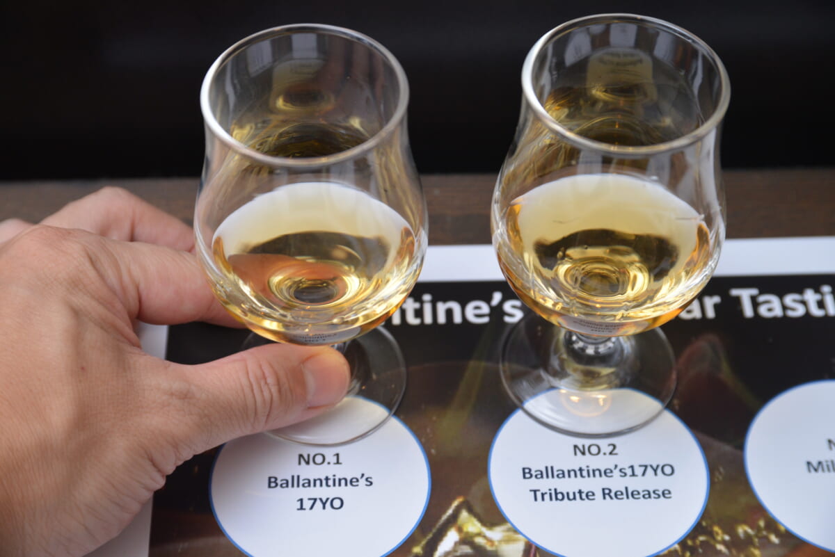 まずは「バランタイン17年」と、「バランタイン17年 トリビュートリリース」をテイスティング。改めて感じるのは、はちみつやバニラを思わせる甘味やフルーティさ、かすかにスパイシーな樽香など、様々な味と香りが複雑に交わり合いながらも高いバランスで調和していること。トリビュートリリースのほうがきらびやかな印象で、通常の17年は気高さや貫禄を感じるテイストです。