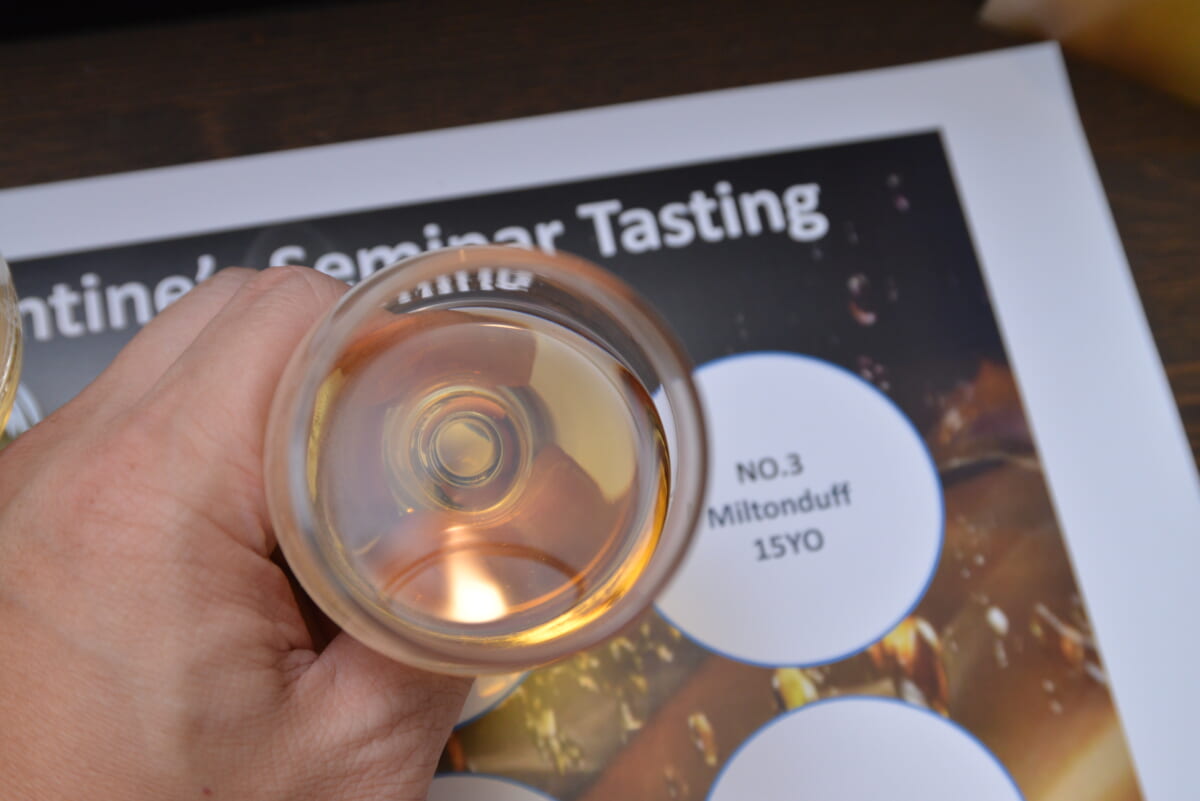次はいよいよシングルモルト。まずは「ミルトンダフ15年」から。ミルトンダフ蒸溜所は、スコッチの中でも華やかで、バランスに優れた名酒が多いと言われているスペイサイドというエリアにあります。