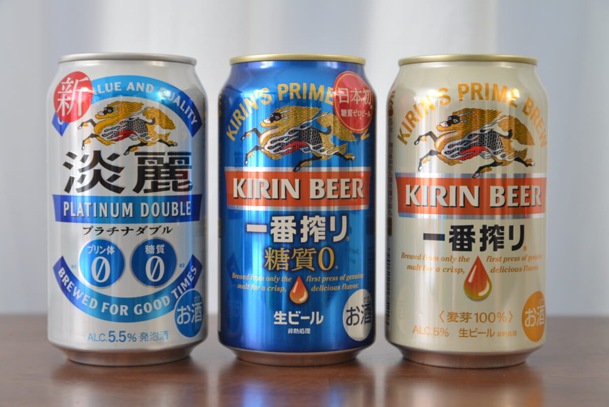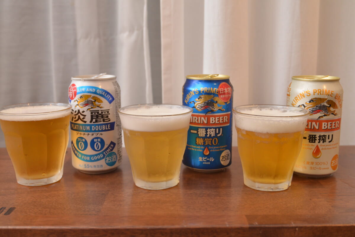 「じゃあ、味はどうなの?」と思うでしょう。そこでひと足早く飲んでみることに。また、より味の違いをはっきりすべく、本家「キリン一番搾り」と、糖質ゼロの発泡酒「淡麗プラチナダブル」と比べてみました。