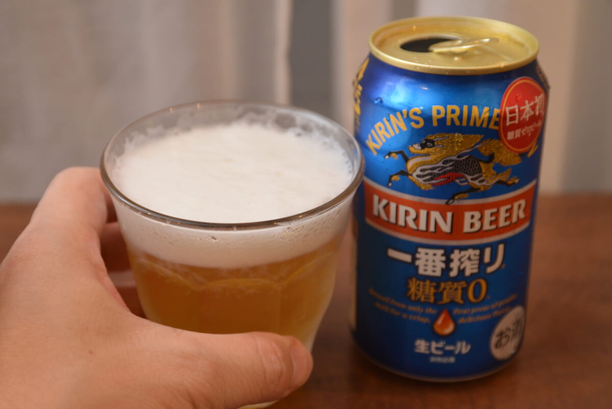 個人的に、スペックで意外だと感じたのが「キリン一番搾り 糖質ゼロ」が最もアルコール度数が低く(4%)、カロリーも一番低い(100mlあたり23kcal)ということ。いわば、様々な面でやさしい造りになっているということです。ということで、まずは今回の主役から飲んでみました。