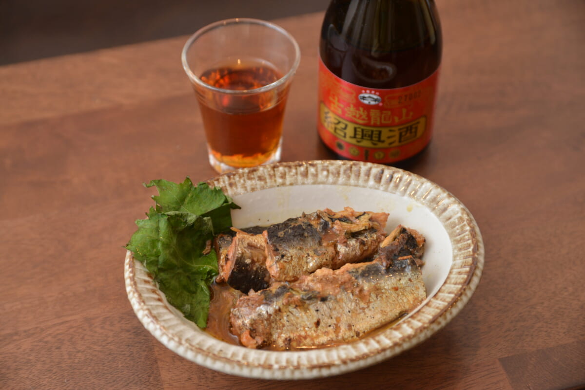 ペアリングも試してみました。用意したのは、メーカー推奨のフードから3品。まずは定番の「古越龍山金龍」と、いわしの蒲焼き缶詰。