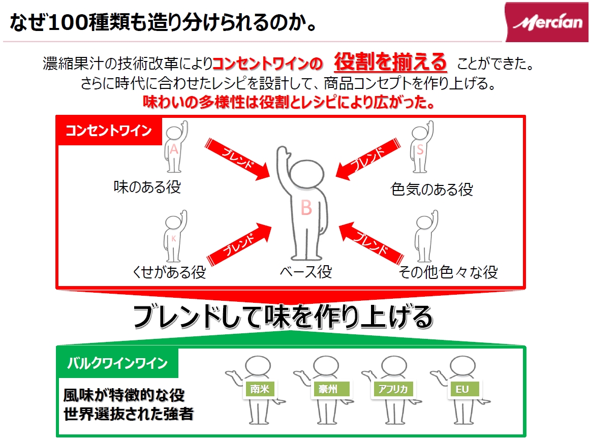 メルシャンではワインの原料となる濃縮ブドウ果汁やバルクワイン(海外で発酵させたワイン)を、世界5大陸から調達しています。北半球と南半球でブドウの収穫時期が異なることを利用して、年間を通じて安定した品質を維持。そうして仕入れた原料を絶妙にブレンドさせることで、商品の“いつもの味わい”を再現しているのです。