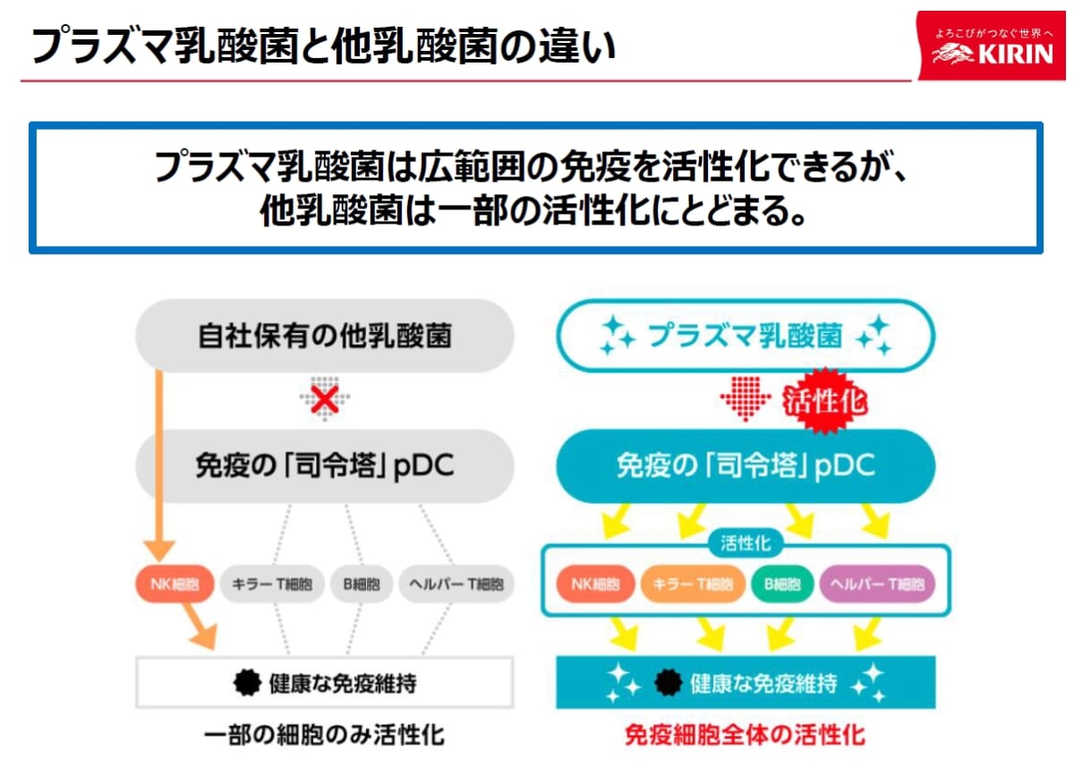 どのバロメーターを測れば、体調が維持されることがわかるのか――そんな客観指標と主観指標の関係性をクリアにしたのが「プラズマ乳酸菌」です。プラズマ乳酸菌、は「pDC(プラズマサイトイド樹状細胞)」に働きかけ、健康な人の免疫機能の維持に役立つことが報告された乳酸菌。免疫細胞の司令塔の役割を果たす「pDC」を活性化させ、外敵に対する対抗を作る「B細胞」などの数々の細胞も活性化させるのです。
