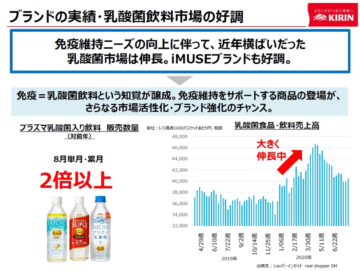 2020年は新型コロナの影響もあり、Googleワードにおける「免疫」の検索数は対前年比(4月)で4倍強となるなど興味関心が高まっているとか。これに伴い、近年は横ばいだった乳酸菌市場も伸長していて、「iMUSE」の飲料売上も1〜8月累計で2倍以上増加しているそうです。